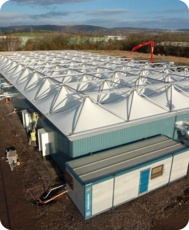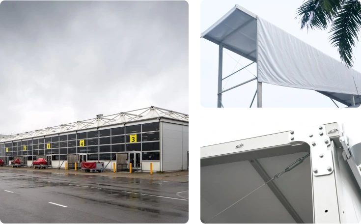 The Revolution tent is a clear span structure with a roof of 6-9 degrees. Its structure is designed to be strong enough to withstand any adverse weather conditions. With spans of 50-60 degrees, it is suitable for industrial workshops and storage facilities.