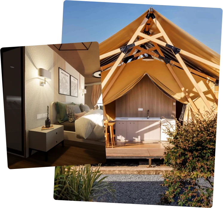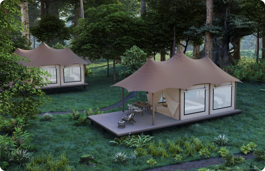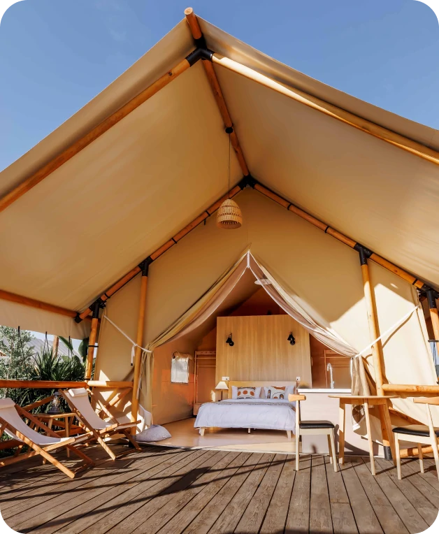 Whether it's budget-friendly glamping or ultra-comfort, SHELTENT has it covered, from basic to elite safari tents. Aside from basic modern furniture, luxurious safari tents also offer bathrooms, kitchens, unique entrances, and windows for ventilation. You can also furnish the interiors with entertainment lounge areas and sofas for an unrivaled luxury camping experience.