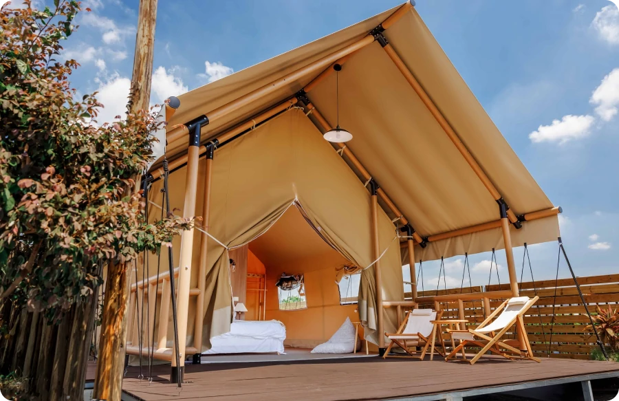 The service life of safari tents is about 10 years. There are lots of reasons why our safari tent is so long-lasting. The strong corrosion- and tear-resistant aluminum alloy frame and PVC material are the first safeguard for your outdoor glamping life for a long time.