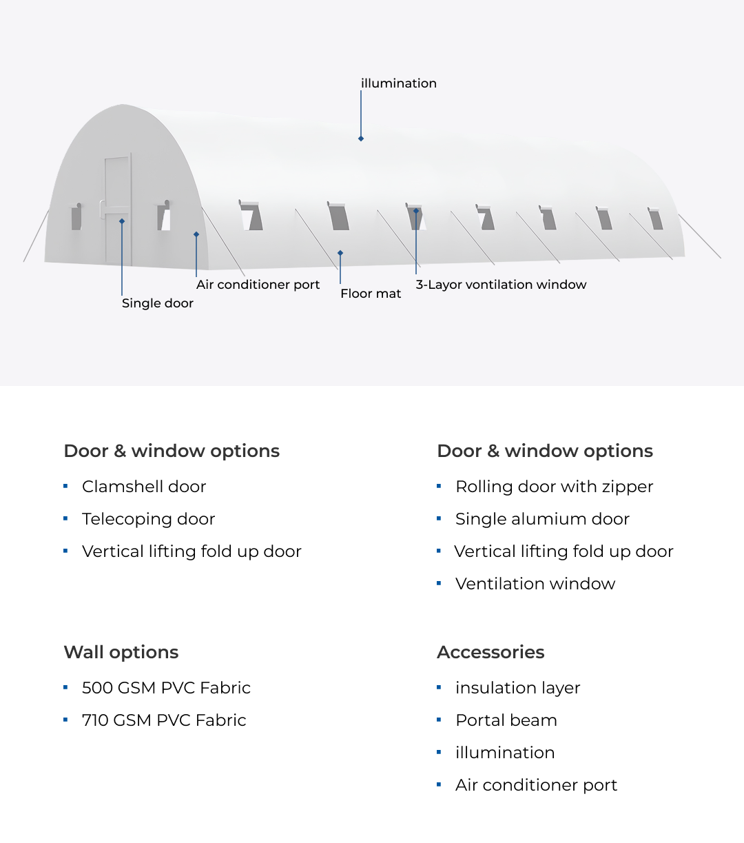 - It can be equipped with ventilation windows with velcro flaps for airflow.