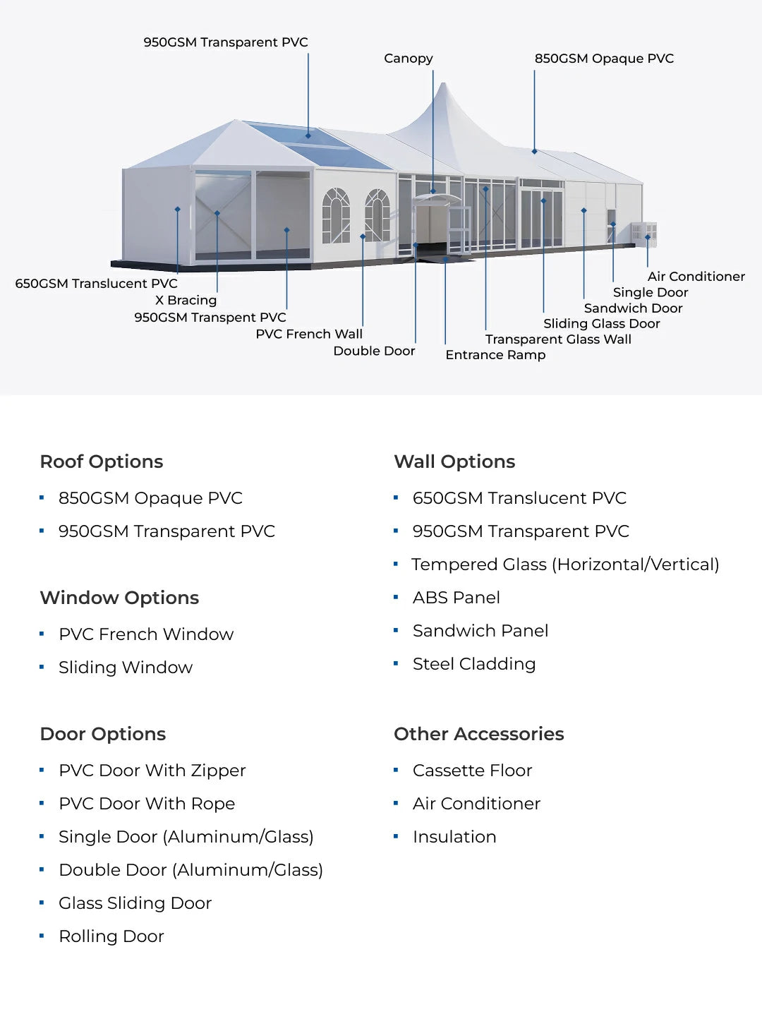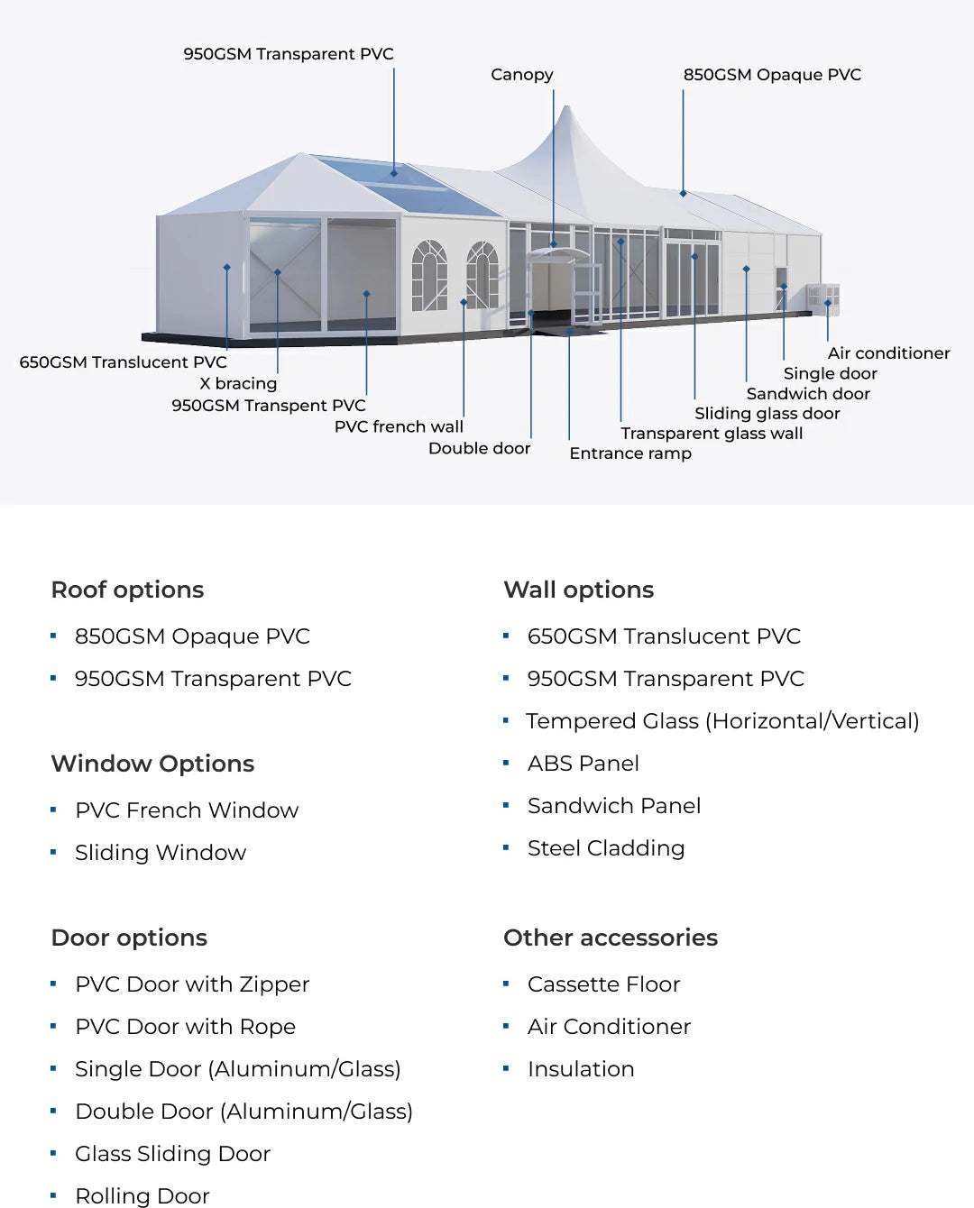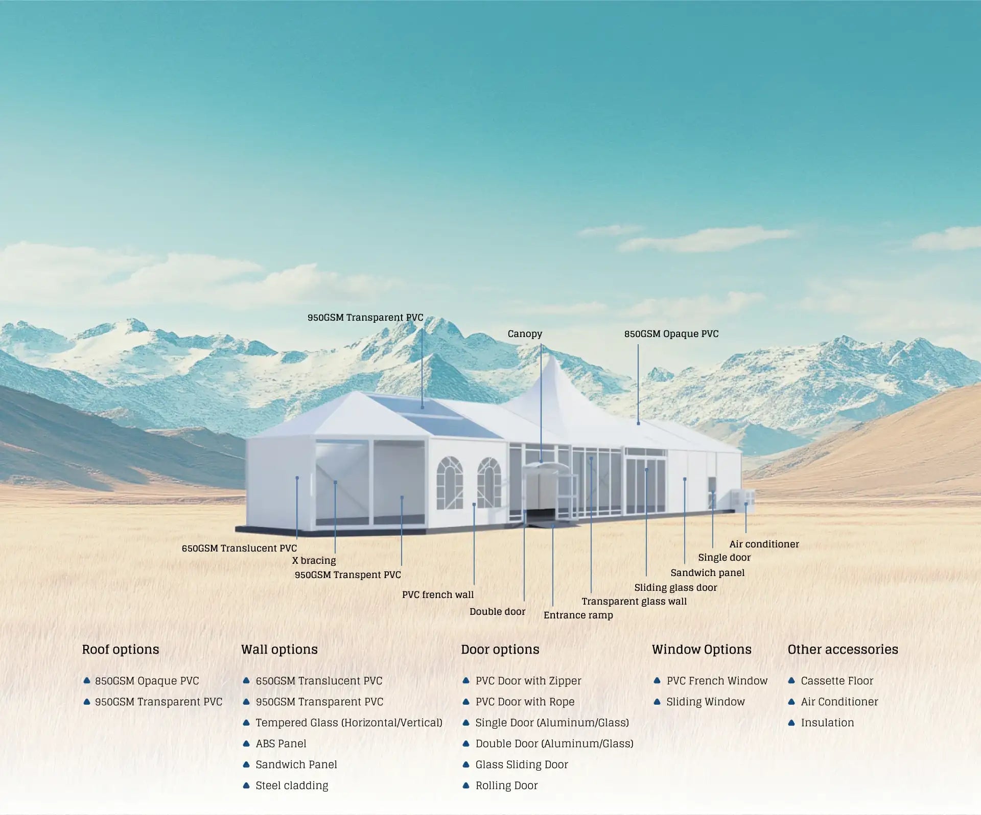 Our circus tents come with HVAC accessories to control the climate. Additionally, with insulation wall options like ABS or tempered glass walls, you won't have to worry about feeling cold.