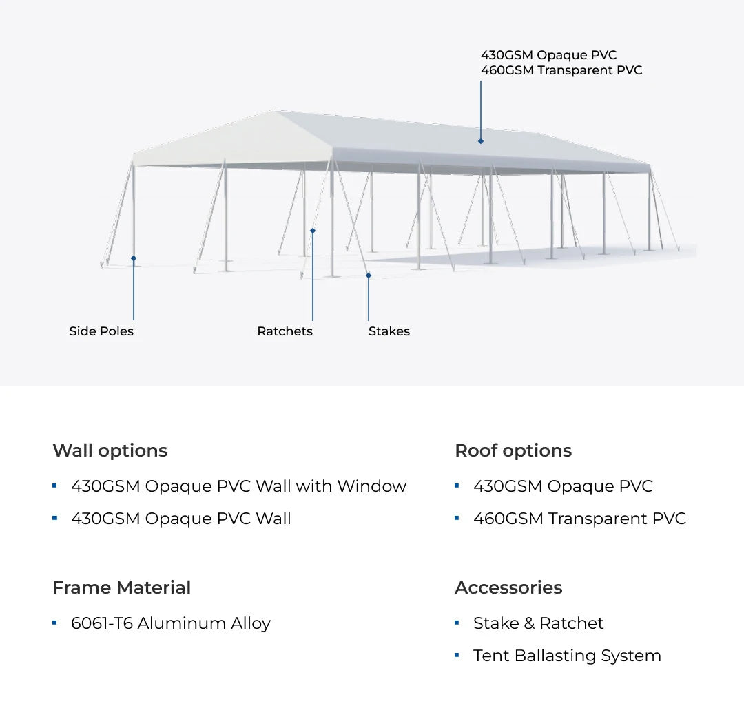 Patio tents usually consist of a metal frame and high-quality tarpaulin. Among them, aluminum alloy and waterproof PVC tarp are the best materials for an outdoor patio tent. High-strength aluminum alloy has a lower weight than cheap iron for rapid construction, while PVC is more waterproof and has higher tensile strength than polyester for long service life.